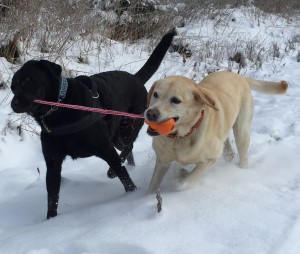 Meine zwei Labbies balgen und spielen im Schnee und strahlen eine Lebensfreude aus, dass es einen einfach nur mitreissen kann.