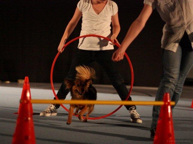Am Nachmittag der Generalprobe lief alles gut, bis dann eines der Mädchen einen der Plastikreifen, durch die wir hüpfen sollten, fallen ließ. Meine Schwester erschreckte sich so, dass sie gar nichts mehr machen wollte. Da ist sie halt sensibel. Aber es half nichts, abends war die Vorstellung. Unser Mensch war furchtbar nervös, die Mädchen wurden herausgeputzt, und wir wurden mit Glitzerzeug eingestäubt. Das war sehr komisch, denn man sah letztlich nicht so viel davon, aber alles war voll Glitzerzeug. Auch das Auto und unsere Bettchen daheim. Die Nummern vor uns liefen wohl toll, und wir hatten auch großen Spaß hinter der Bühne. Denn da wir keine Leinen anhatten, war es gar nicht so leicht, uns vom Erkunden der ganzen Sportgeräte, die da gestapelt waren, abzuhalten. Alles war so spannend! Und dann wurden unsere Sachen aufgestellt. Die Mädchen schnappten sich die Reifen, unser Mensch platzierte sich am Rand und unser Lied begann. Die erste Runde mussten wir durch die Beine der Mädchen laufen. Das ging super. Dann kamen die Reifen. Ich hatte kein Problem, aber Lilly hatte etwas Angst, sodass unser Mensch helfen musste. Danach lief es aber wieder toll weiter, und die restlichen Tricks konnten die Mädchen ganz allein mit uns. Die Menschen applaudierten und fanden uns ganz furchtbar süß.