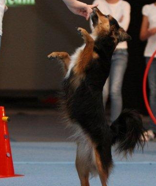 Beim ersten Treffen gab es eine Art Casting. Das war lustig! Eine ganze Menge Menschenmädchen wollten mit uns Tricks machen. Das war natürlich Klasse, denn Tricks liebe ich! Mit oder ohne Keks, aber mit ist schöner. Selbstverständlich können wir allerhand, zum Beispiel durch die Beine laufen im Slalom oder Achter, springen in allen Varianten, Pfötchen geben und noch viel mehr. Beim Casting ging es eher darum, welches Kind was kann. Manche hatten wirklich ein bisschen Schwierigkeiten mit den einfachsten Handzeichen! Am Ende war dann für jeden etwas gefunden und unser Mensch machte sich an die Choreographie.