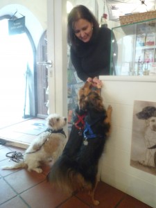 Es gibt aber noch einen weiteren Grund, weshalb wir die Sabine samt ihrem Laden so toll finden: die Fotoshootings. Ab und zu, so zweimal im Jahr, packt ihr Mann Jason den Fotoapparat aus, und dann geht’s los! Eine ganze Viertelstunde lang wird dann jeder Hund fotografiert, und ihr könnt euch sicher sein, dass die Sabine mit ihren Keksen sogar den stursten Dackel zum Supermodel macht! Wir beide haben das Posen selbstverständlich im Blut. Wer kann denn bitteschön traurig schauen, wenn eine quietschende und lachende Sabine durch den Raum hüpft mit pfundweise Zookieskeksen im Anschlag? Ich persönlich gebe immer mein Allerbestes, und meine Schwester Lilly ist auch nicht schlecht, auch wenn sie immer vergisst, die Öhrchen nach vorne zu klappen. Das einzige, was bei diesen Shootings stört, ist unser Mensch. Natürlich wollen wir immer beide bei Sabine sein (Welcher Hund möchte das bitte nicht?), aber wenn nur eine von uns fotografiert werden soll, hält unser Mensch eben die andere ein bisschen fest. So eine Gemeinheit! Von uns aus könnte sie gerne in der Zeit einkaufen gehen oder was Menschen so machen, aber nein, sie stört immer unser tolles Shooting. Am Ende ist sie dann immer unglaublich begeistert von den wunderbaren Fotos, und alle unsere Freunde bekommen welche geschenkt. Vor allem die Simona und ihre Mama im Tierheim in der Slowakei sind immer völlig gerührt und sagen, wir seien jetzt Prinzessinnen. Na klar, was denn auch sonst? Und wisst ihr, was das Beste ist? Auch das Geld vom Shooting wird gespendet! Letztes Mal hat auch unser Verein, der den Waisenhunden in der Slowakei hilft, etwas bekommen. Das ist doch toll!
