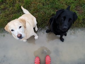 Und wenn man dann mal draussen ist, dann ist das Regenwetter meistens gar nicht so schlimm, wie es von drinnen ausgesehen hat. Meine 2 Labbies sind natürlich so richtige Wasserratten, die einfach immer gute Laune haben. Und wenn dann Frauchen mit durch die Pfützen matscht, dann gibt es ausser Fressen nichts Schöneres mehr für die Beiden.