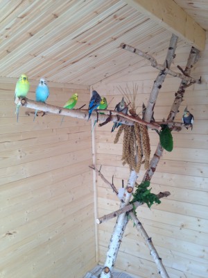Wir haben bei unserem Vogelbaum ein stabiles Brett als Grundlage für den Vogelbaum gewählt und diesen auch an der Decke des Schutzhauses befestigt. Eine Lage Zeitungspapier unter dem Vogelbaum macht die Reinigung zum Kinderspiel.