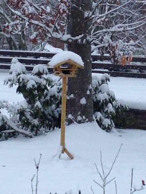 2. Das Futterhaus sollte geschützt und an einer übersichtlichen Stelle aufgestellt werden. Katzen sollten sich nicht unbemerkt anschleichen können. Das Beobachten der Vögel sollte möglich sein. In etwas Abstand sollten sich Hecken/Büsche/Sträucher/Bäume befinden, in denen die Vögel bei einem Sperberangriff Unterschlupf finden können. Falls sich in der Nähe Glasscheiben befinden, sollten sie diese mit einem Vogelmotiv oder dergleichen kenntlich machen.